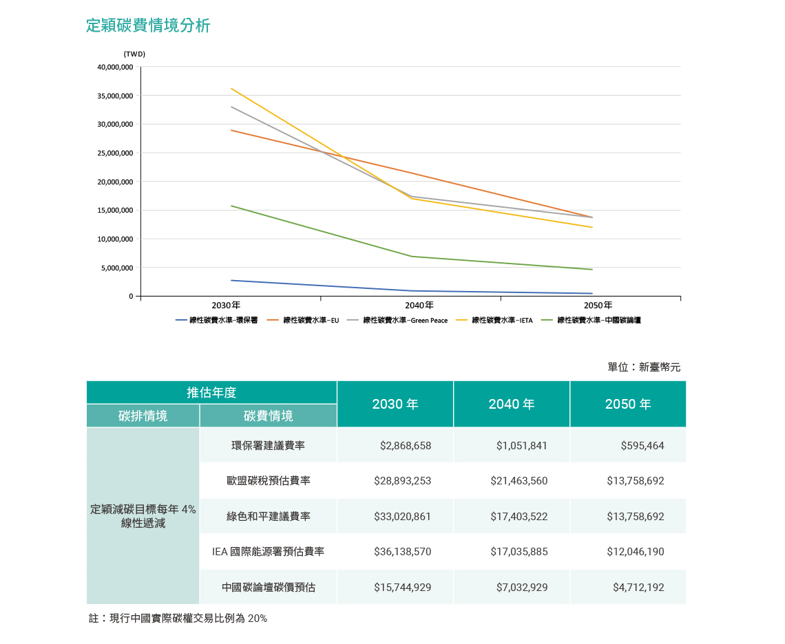 定穎以 2020 年溫室氣體排放總量 217,322.5717 公噸 ( 僅列範疇一、二 ) 為基礎,每年減碳比例以定穎減碳目標 – 每年 4% 線性遞減,並採用「環保署建議費率」、「歐盟碳稅預估費率」、「IEA 國際能源署預估費率」、「綠色和平建議費率」及「中國碳論壇碳價趨勢調查」等五項碳價格之水準預測,且依現行中國實際碳權交易比例計算,評估未來至 2050 年定穎在不同情境下,將會有何程度的曝險結果。