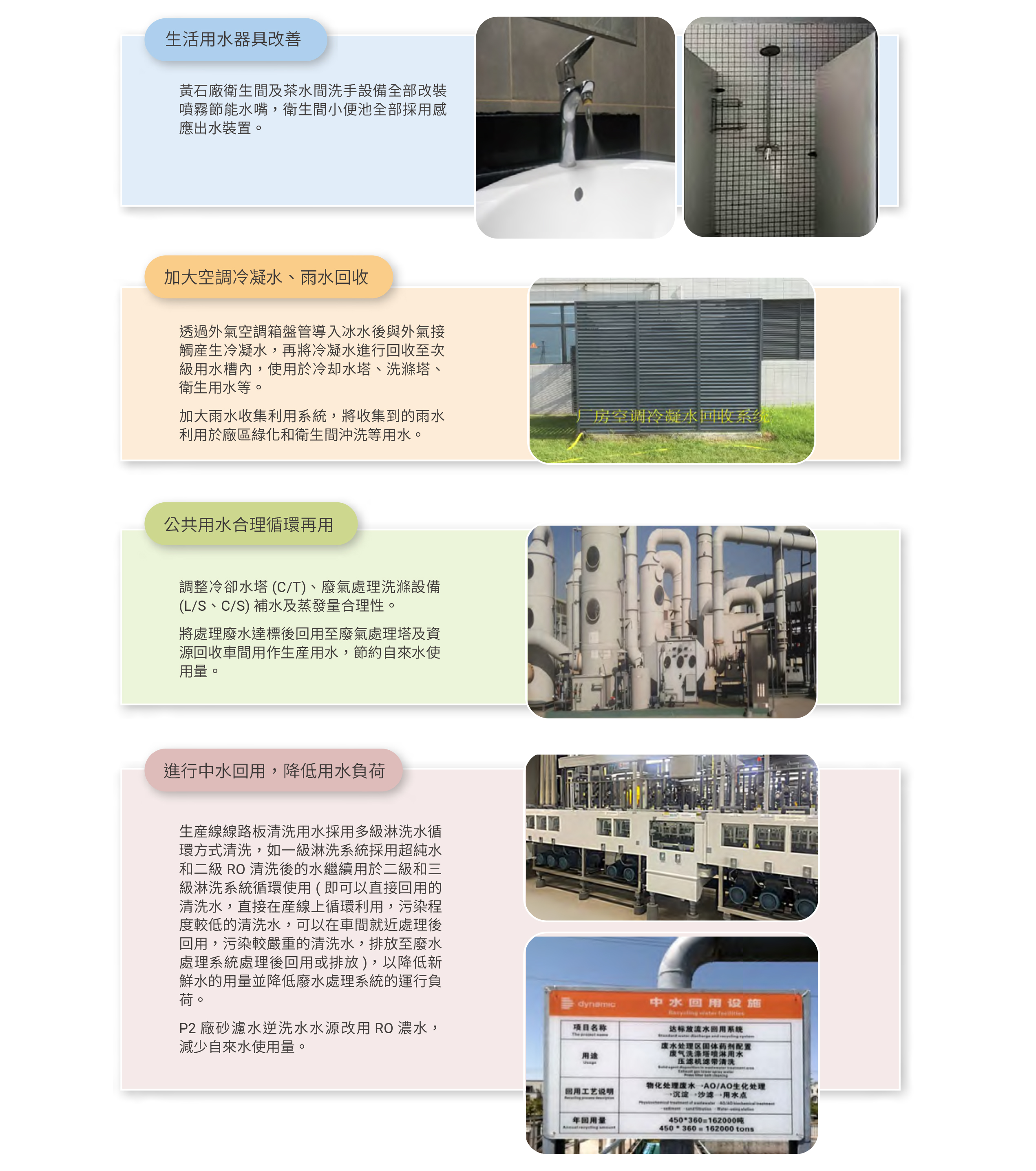 黃石廠目前為集團主要之用水單位,2024 年黃石廠用水量達到 400 萬噸,較 2018 年增加 261.66%,主要仍是因工廠持續擴增產能,同時黃石 P2 廠也在 2023 年下旬投入量産,因而用水量明顯提升;近年來因應用水量大增,除了在公共設施進行節水外,也透過技術改善减少製程用水。