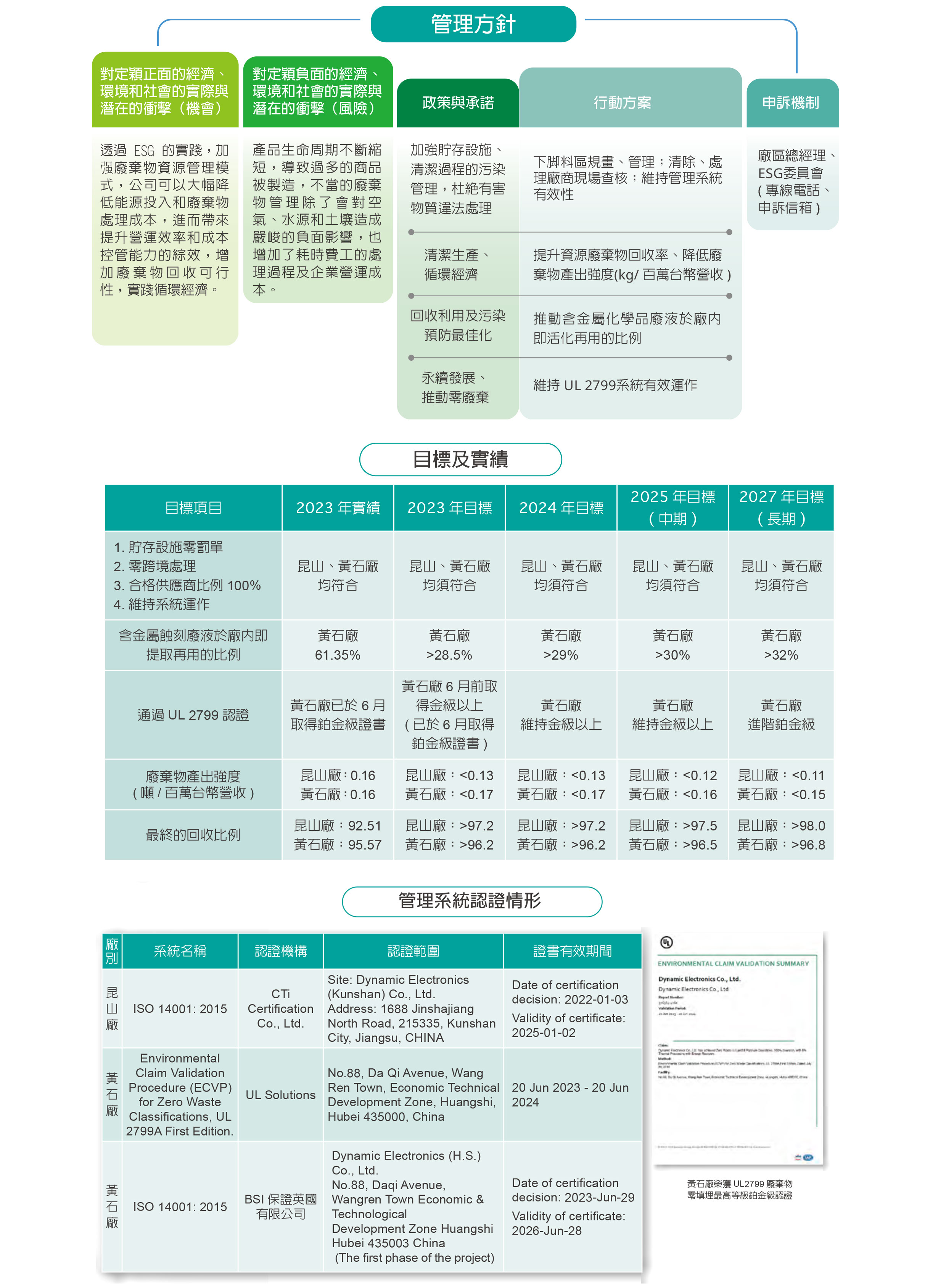 ● 持續維持ISO14001(環境)、ISO50001(能源)、QC080000(材料不含環境關聯物質)、AWS(可持續水管理)、UL 2799(零廢棄物填埋)等環境相關系統之有效性。