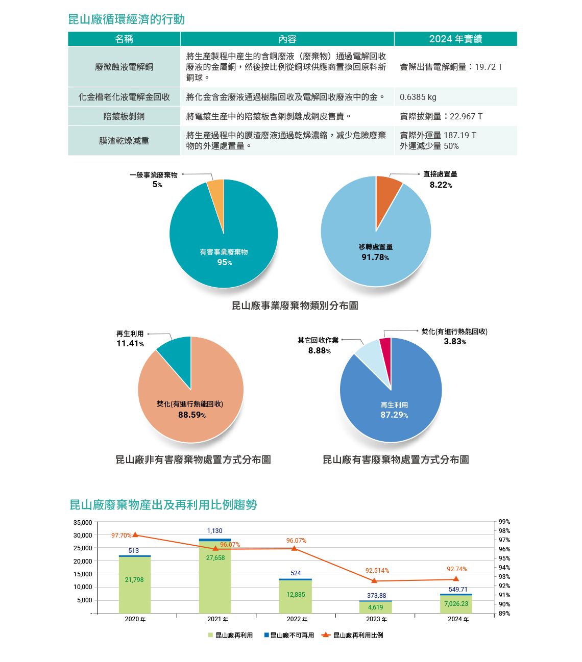 2024 年回收再利用比例稍降低,主要是因為昆山廠以焚燒為最終處理之膜渣於廠內乾燥不足所致,因受限於人力及能源使用之考量,致膜渣外運處理重量成長 78%。