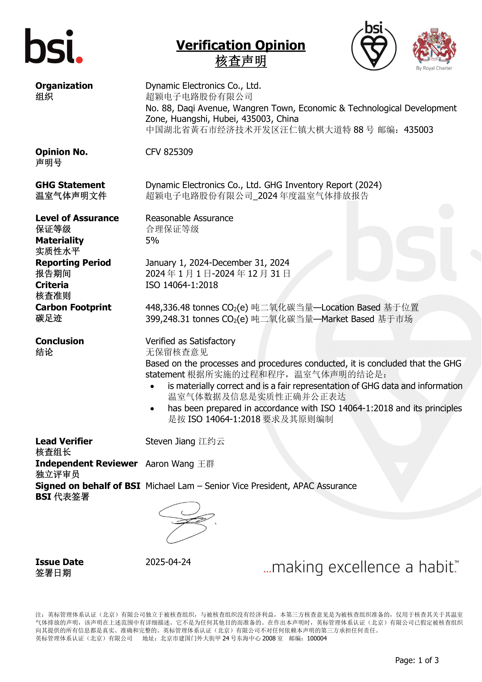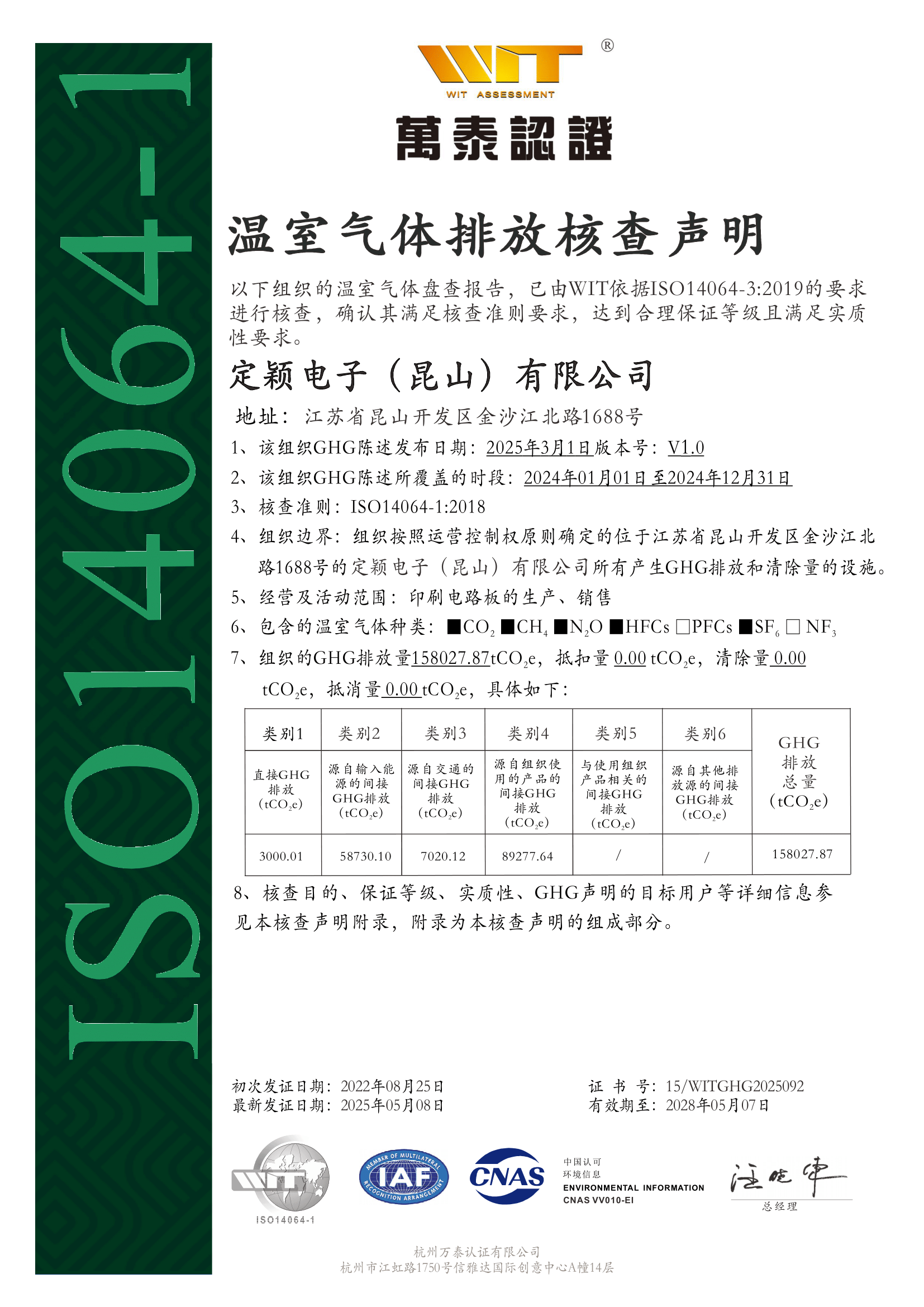 2025年昆山廠 ISO14064-1 溫室氣體排放核查聲明書