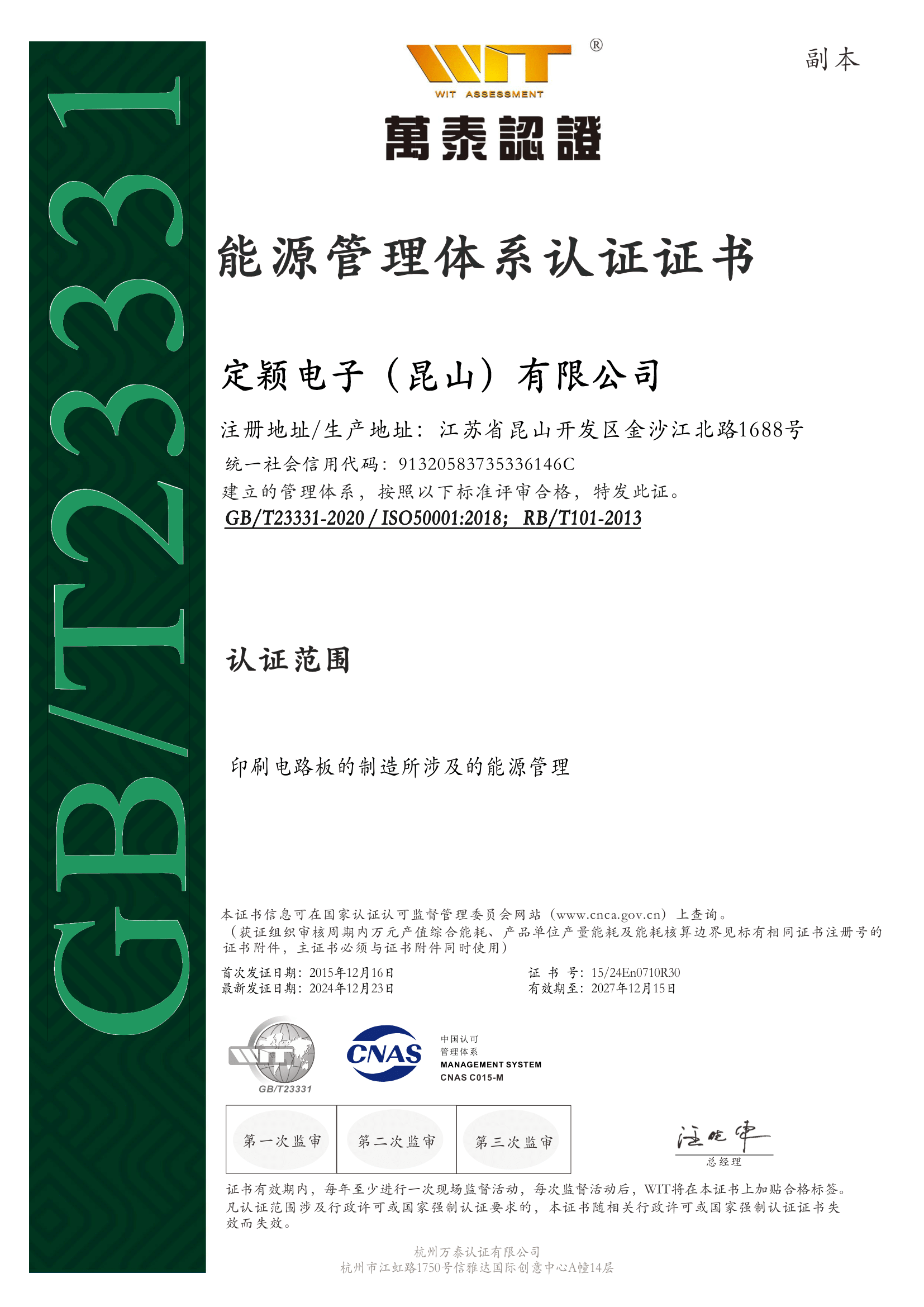 昆山廠:ISO50001印刷电路板的制造所涉及的能源管理证书