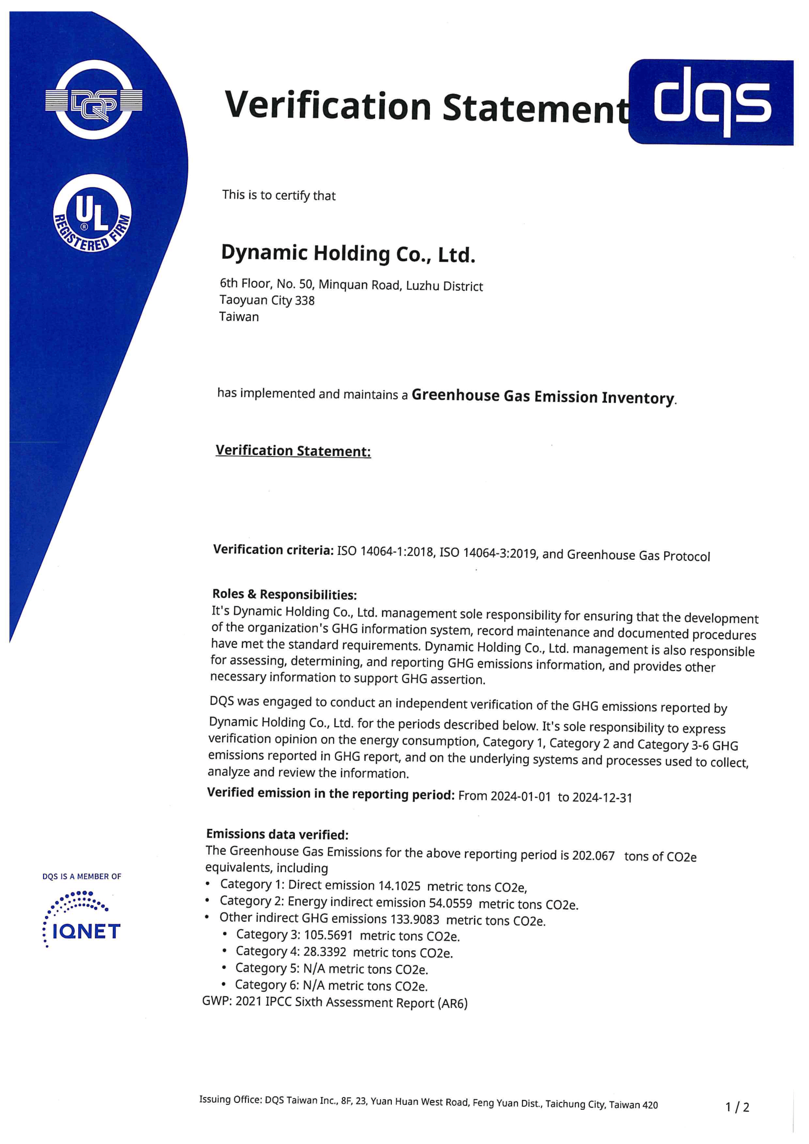 2024年桃園營運中心 ISO14064-1 溫室氣體排放核查聲明書