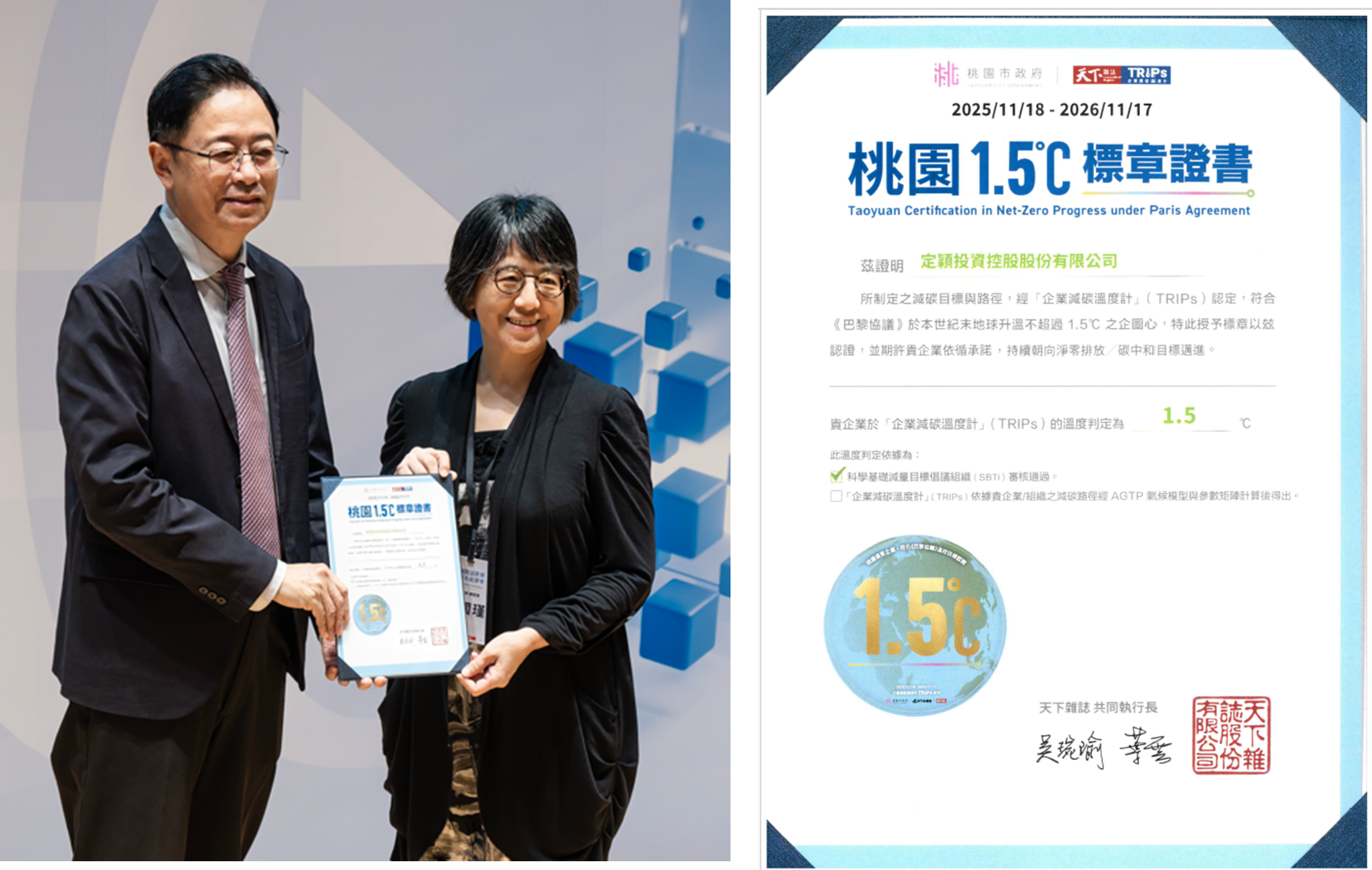 定穎透過《天下雜誌》與東海大學合作的 「企業減碳溫度計(TRIPs)」,運用公開資料精準計算符合巴黎協定 1.5°C 標準的減碳目標,榮獲 「桃園 1.5°C 典範企業」 的殊榮與標章授予。這份肯定象徵定穎成為城市淨零的推手與代言人,讓在地居民與國際社會都能感受到桃園企業攜手減碳的力量與企圖心。
